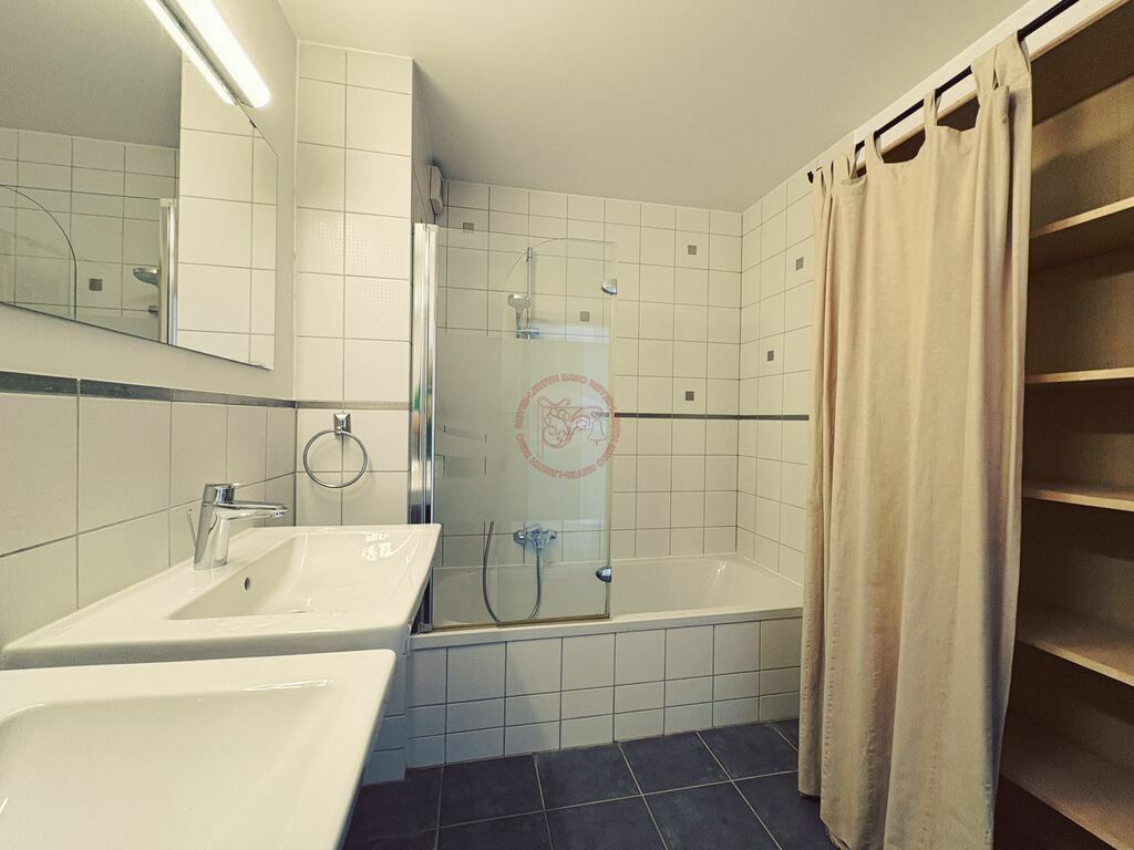 Salle de bains de +/- 6 m² avec double lavabo et baignoire